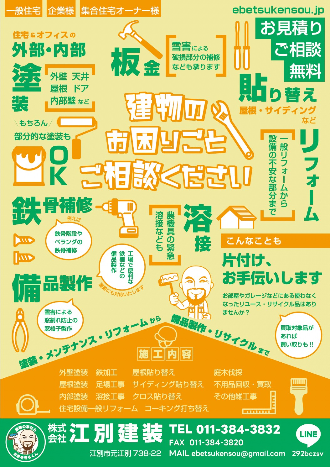 家や建物の塗装、メンテナンスは株式会社江別建装へお任せ下さい。